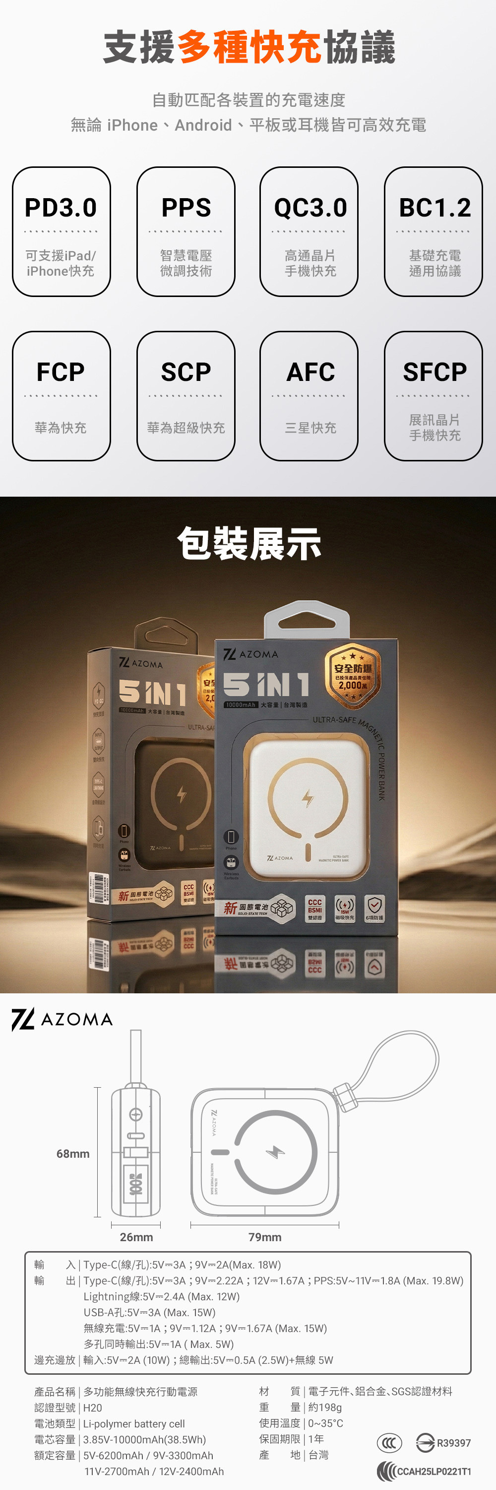 輸出:Type-C(線/孔):5V⎓3A;9V⎓2.22A;12V⎓1.67A;PPS:5V~11V⎓1.8A (Max. 19.8W)